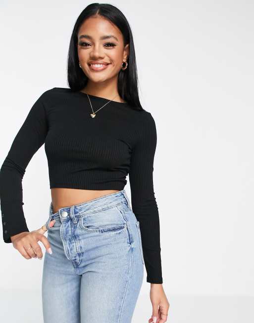 ASOS DESIGN Crop top met lange mouwen en drukknoopjes op de mouwboorden in zwart Very well made.