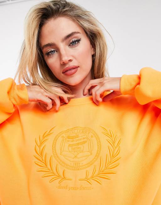 Bershka embroidered slogan oversized sweatshirt in orange Very well made.