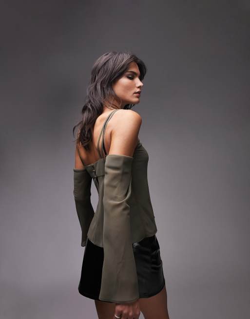 Topshop cold shoulder strappy long sleeve top in khaki ASOS Very well made.