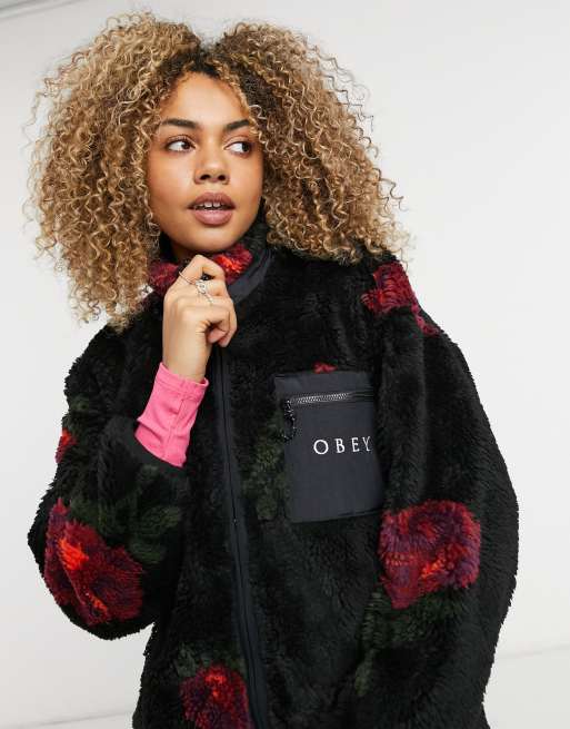Obey oversized zip up fleece jacket in floral borg with logo pocket Very well made.